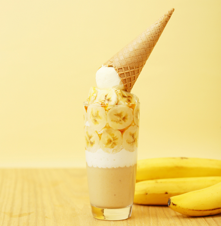 王道の組み合わせ、バナナとキャラメルをトッピング。中のスムージーは、ヨーグルト入りでさっぱりとした仕上がりに。バナナキャラメルと、自家製スムージー、ワッフルコーンが絶妙な組み合わせだよ♪