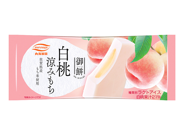 瑞々しく華やかなアイスバー「御餅 白桃涼みもち」 は、春夏の季節限定商品。白桃の華やかな香りや上品な甘さ、瑞々しい果汁感が特徴のジューシーな味わい。中には、白桃風味のやわらかいお餅が入っていて、モチモチ食感も楽しめちゃう。
