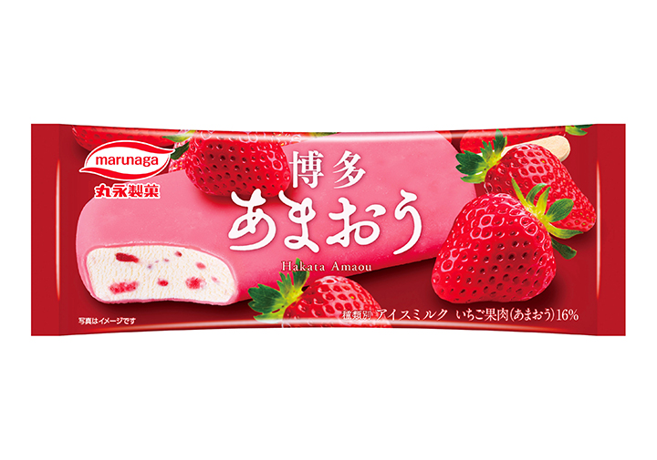 福岡県特産のブランド苺「あまおう」を使用した「博多あまおうバー」。あまおう果肉がミックスされたミルクアイスの周りを、赤いいちご風味チョコでコーティング。なめらかな白いアイスに、甘酸っぱいあまおうの赤い果肉がよく映えて、見た目にも鮮やか♡