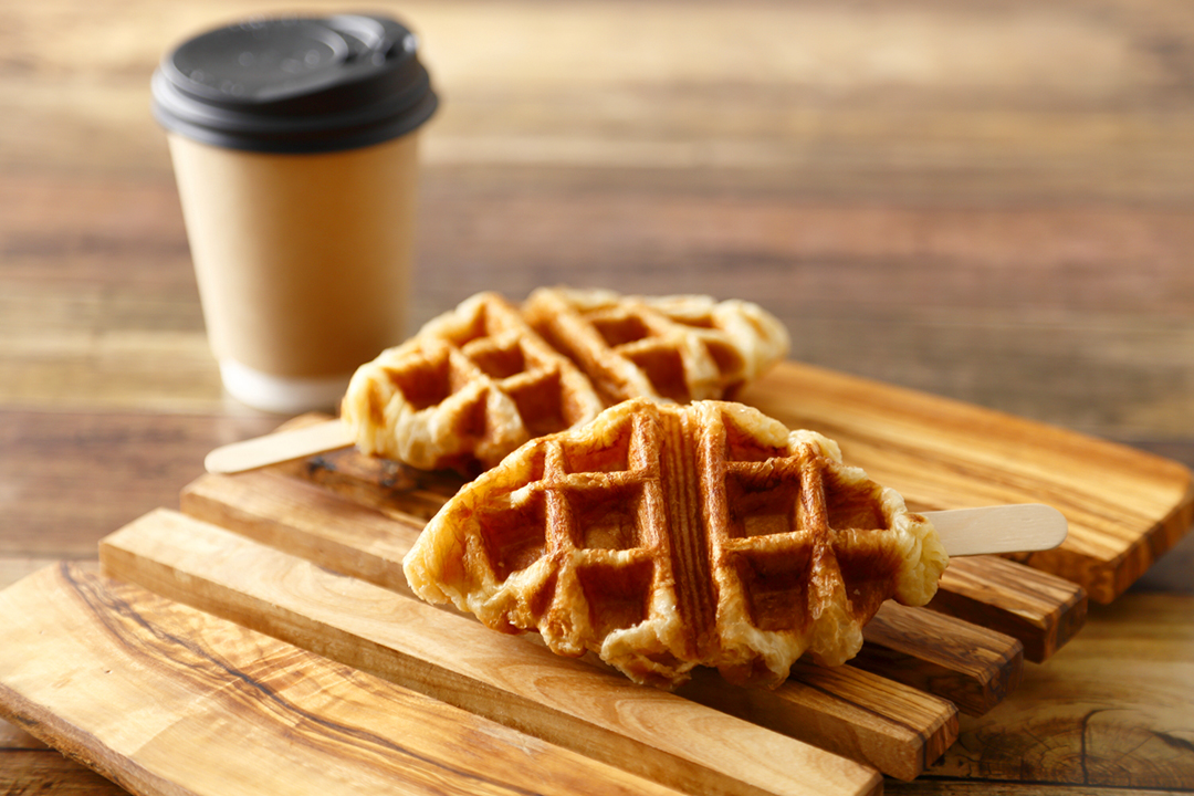 見た目はワッフルだけど、生地はクロワッサン生地を使用した新感覚スイーツ「クロワッフル」。原宿のファッションストリートでの買い物途中や小腹がすいた時に、気軽に楽しむことができるよ。持ち手がバーになっているから、手を汚さずに食べられるのも嬉しいポイント♡