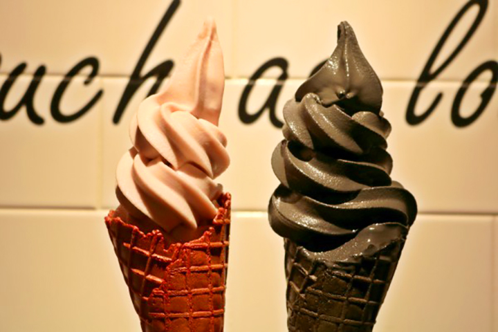 牛乳たっぷりのソフトクリームに竹炭パウダーを混ぜ、真っ黒な仕上がりに。エッジの効いた見た目とは違い、ミルクの程よい甘さが優しく口に広がるよ。しかし油断は禁物!!食べ終わった後は、真っ先に鏡で口の周りをチェック(笑)。