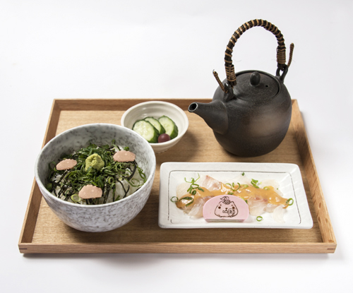 いわいさんが、仔いわいさんと一緒に、めでたい鯛を持って10周年をお祝いしにやってきた。昆布締めした鯛の上には煮だした酒、味噌、すり潰した胡麻を合わせたソースに豪華にトリュフオイルが。仔いわいさんがのったご飯の上に鯛を乗せて出汁をかければ、トチュフの香りが広がる豪華なお茶漬け。