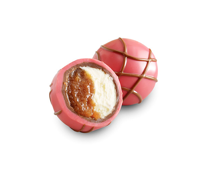 ミルクチョコレートとストロベリー色のホワイトチョコレートの中に、なめらかなストロベリーピューレとバニラムースが詰まっているよ。
