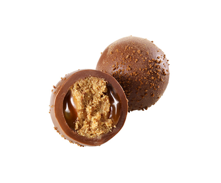 なめらかなバタースコッチキャラメルと、口あたりの良いウォルナッツクリームをミルクチョコレートで包み、糖蜜のパウダーで仕上げているよ。