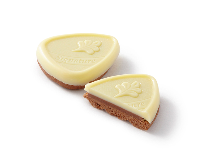 サクサクしたビスキュイの上に、なめらかなラズベリークリーム入りのホワイトチョコレートをのせて。