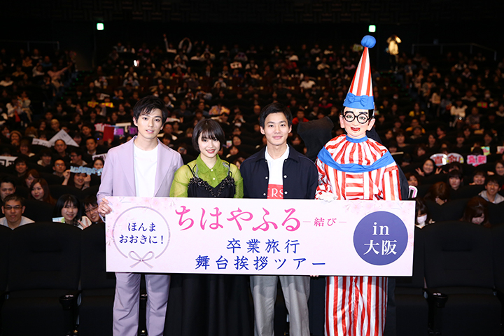 そしてこの度、本作の大ヒットスタートを記念して、“ちはやふる卒業旅行舞台挨拶ツアー”と称し、2018年3月24日(土)・25日(日)、広瀬すず、野村周平、新田真剣佑の3人による大阪・京都・名古屋での大ヒット記念舞台挨拶が行われた。