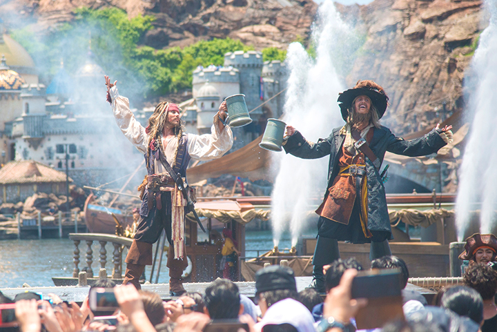 キャプテン・ジャック・スパロウとキャプテン・バルボッサ率いる荒くれ者の海賊たちが繰り広げるショー「パイレーツ・サマーバトル“ゲット・ウェット!”」を公演。大量の水を浴びて全身びしょ濡れになりながら、海賊たちによる大迫力の戦いをエンジョイしよう!