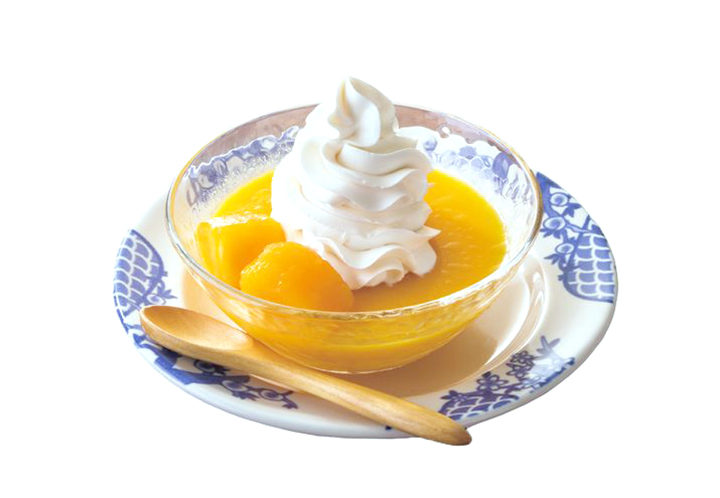 香り豊かなマンゴーピューレをたっぷり使用した、濃厚な味わいのとろ〜りマンゴープリンの上にはホイップクリームクリームがたっぷり☆ 夏にピッタリなさっぱりとした一皿に仕上がっているよ。