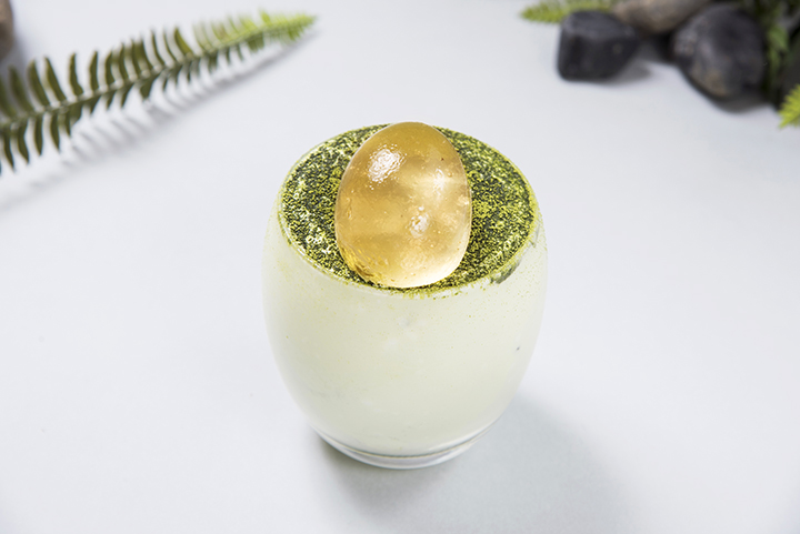 琥珀の化石のように透き通ったゼリーは、エルダーフラワー風味。ホワイトチョコ&抹茶のスムージーとも、相性バツグン◎