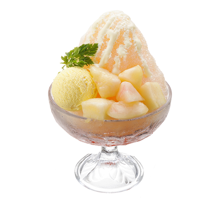 「桃のミルクフラッペ」は、ひんやりかき氷に上品な甘みと香りのピーチシロップをたっぷりかけ、みずみずしい果肉を添えたフラッペ。練乳の濃厚なコクが、桃の爽やかさを引き立ててくれる♡