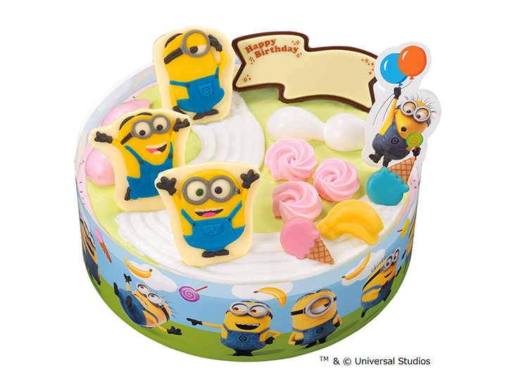 丘を転がるアイスクリームやバナナを一目散に追いかける“ミニオン”たち。バルーンを持った“ミニオン”のピックや、たくさんの”ミニオン”が登場するフィルムで、ハチャメチャな”ミニオン”ワールドが完成!アイスクリームやバナナ、それを追いかける”ミニオン”はチョコレート。ピンクやグリーンのホイップもかわいい、みんなで楽しく食べたいアイスクリームケーキ♪