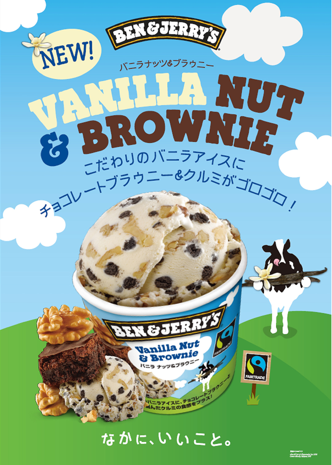 『バニラ ナッツ&ブラウニー』は、ベン&ジェリーズ自慢の濃厚バニラアイスクリームに、相性バツグンのナッツやブラウニーのチャンクがゴロゴロ入ったベン&ジェリーズらしい新フレーバー。