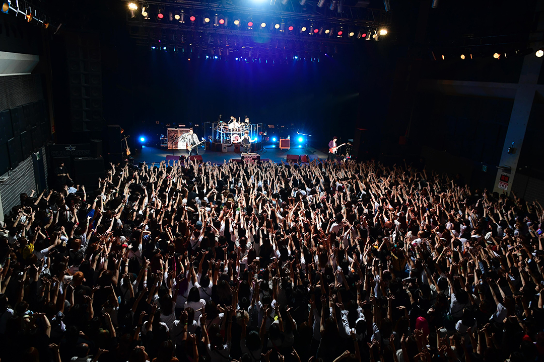 ゆうやが叩き出す猛烈な2ビート、明希の重くうねるベース、Shinjiの高速ギターリフに乗ってマオが叫ぶ。8月に出た新作ミニアルバム『いちばん好きな場所』の1曲目を飾った「VOICE」は、生で聴くとよりエモく激しく、サビで一気に空間が広がる感触がたまらなく気持ちいい。同じく新作からの「reverb」は、エレクトロ・サウンドを大胆に取り込んだヘヴィなメタリック・ダンスロックで、前作『NOMAD』収録のメタルチューン「XYZ」と並べて聴くと、興奮が倍増する。「頭からぶっ飛ばしていくぞ!」と叫び、マオが客席最前列に両足を突っ込んで歌っている。差し出された何本もの腕でマオが宙に浮いているような、その光景が一枚の美しい画に見える。