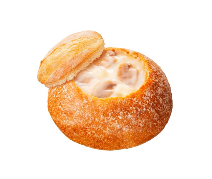 香ばしい石窯パンをくり抜き、3種のチーズときのこ、そして「アーモンド効果<佐藤不使用>」入りのポタージュを詰め込んだ、寒い日にぴったりなホッと温まる味わい♪