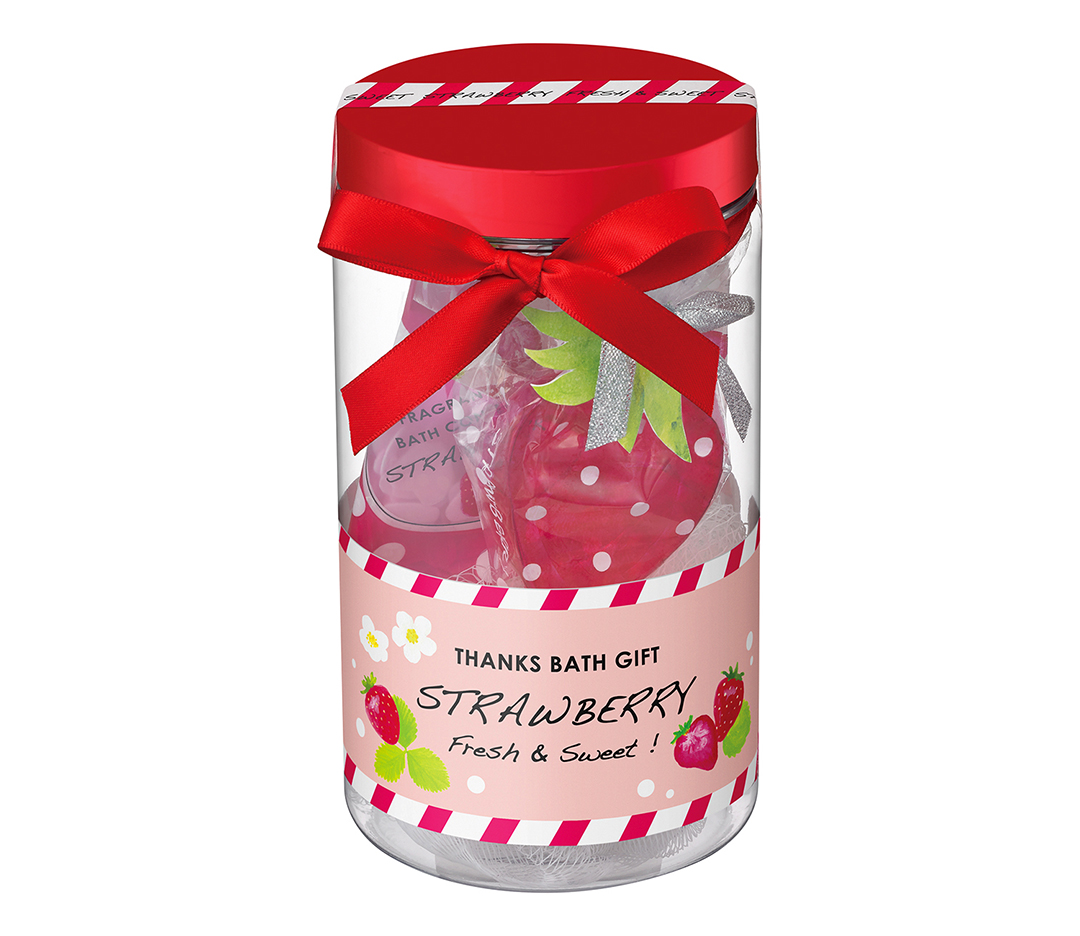 バスソルト、バスコンフェッティ、ゲストソープ、バススポンジをセットに。イチゴの香りを思う存分堪能できちゃう、スペシャルな詰め合わせだよ☆