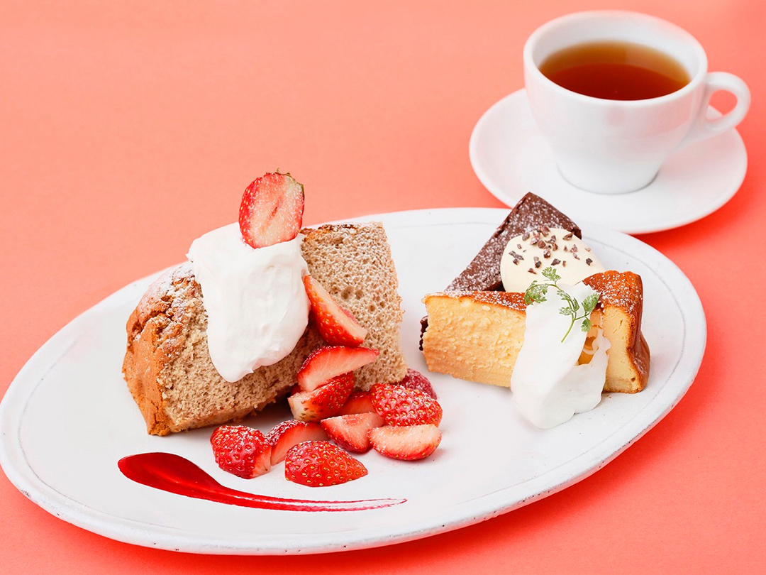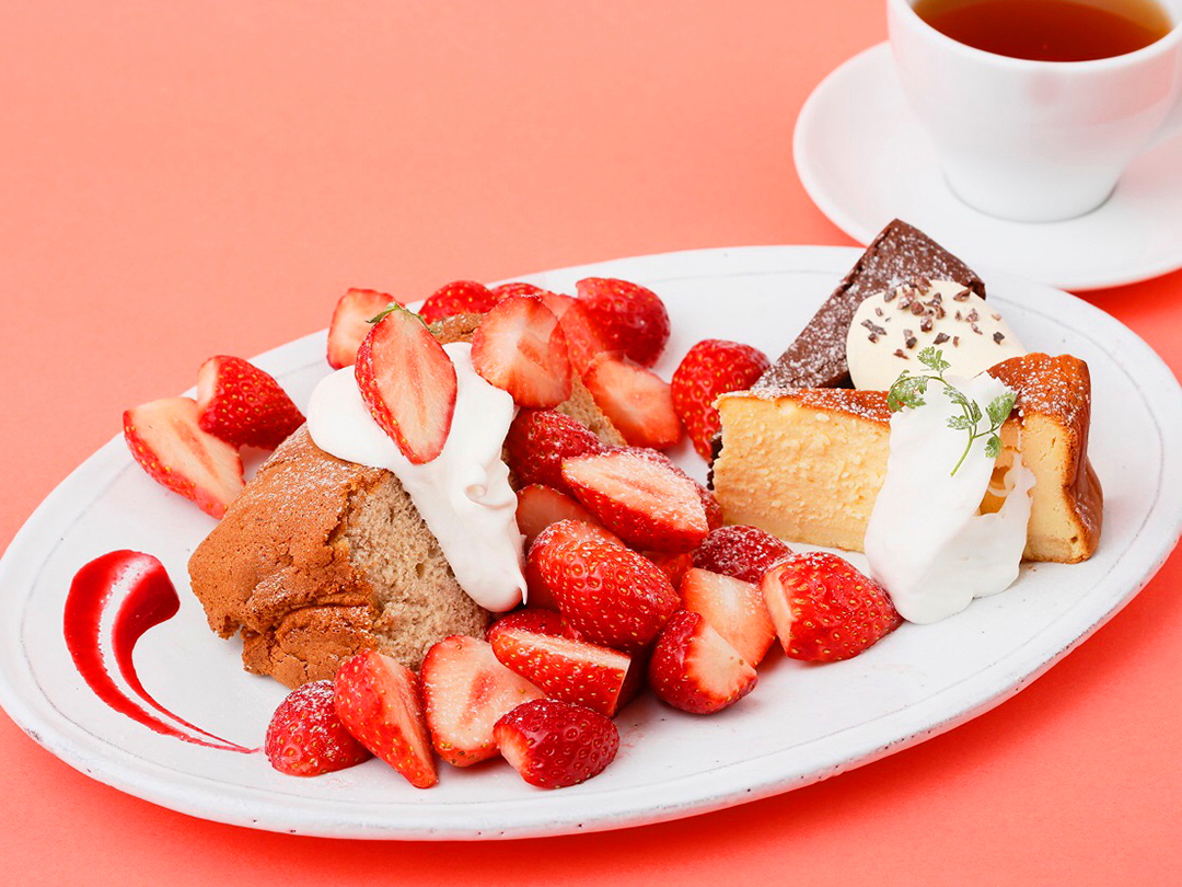 苺たっぷりのストロベリーシフォンケーキに、本日のデザート2種を贅沢にプラス。3種のデザートがお得に楽しめる、期間限定のスペシャルデザートプレート。