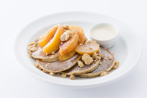 品川店、代官山店限定のピーチクランブル パンケーキは、マクロビフードなどによく使われる全粒粉でパンケーキをヘルシーに仕上げ、オリジナルシロップに漬けたピーチのコンポートをトッピング。アクセントにサクッとした食感が特徴のクランブルを上からちらし、まよやかなテイストのメープルクリームソースを合わせて召し上がれ。