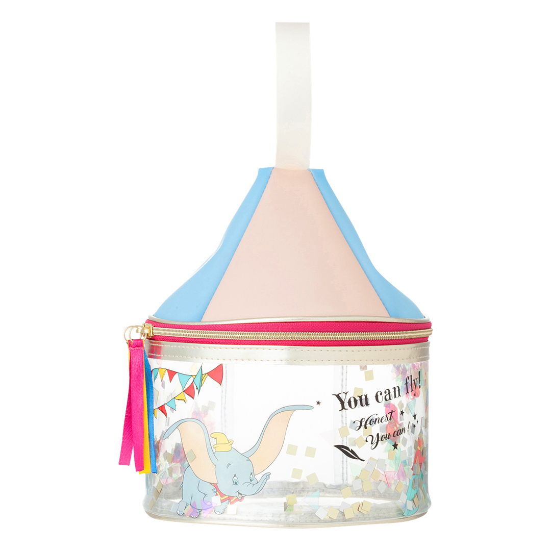 ラメや紙吹雪のスパンコールが動く、ダンボのサーカスをイメージした遊び心たっぷりのテント型マルチケース。ガバッと大きく開くから、出し入れも簡単だよ♡