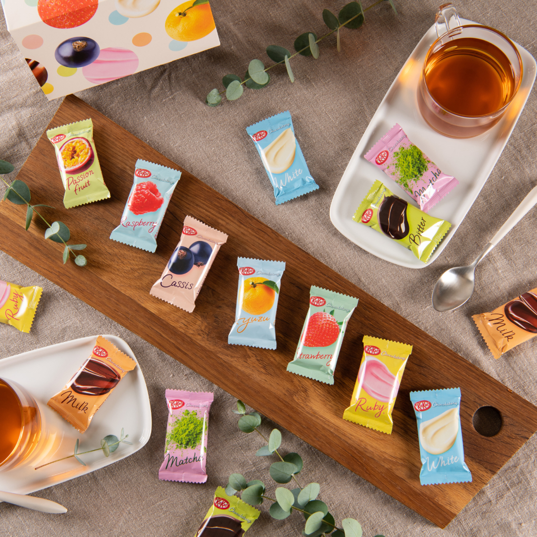さくら、ピスタチオ、塩キャラメル、ビター、 ミルク、ホワイト、ルビー、抹茶、ストロベリー、カシス、ラズベリー、パッションフルーツ、ゆず